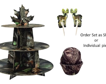 Tree Bark Cupcake Stand and 24 Tree Bark Baking Cups with Deer Picks, Next Camo Cupcake Stand, Deer Picks